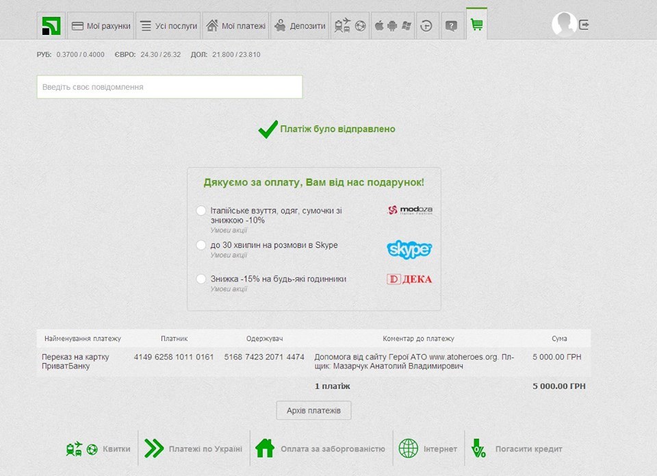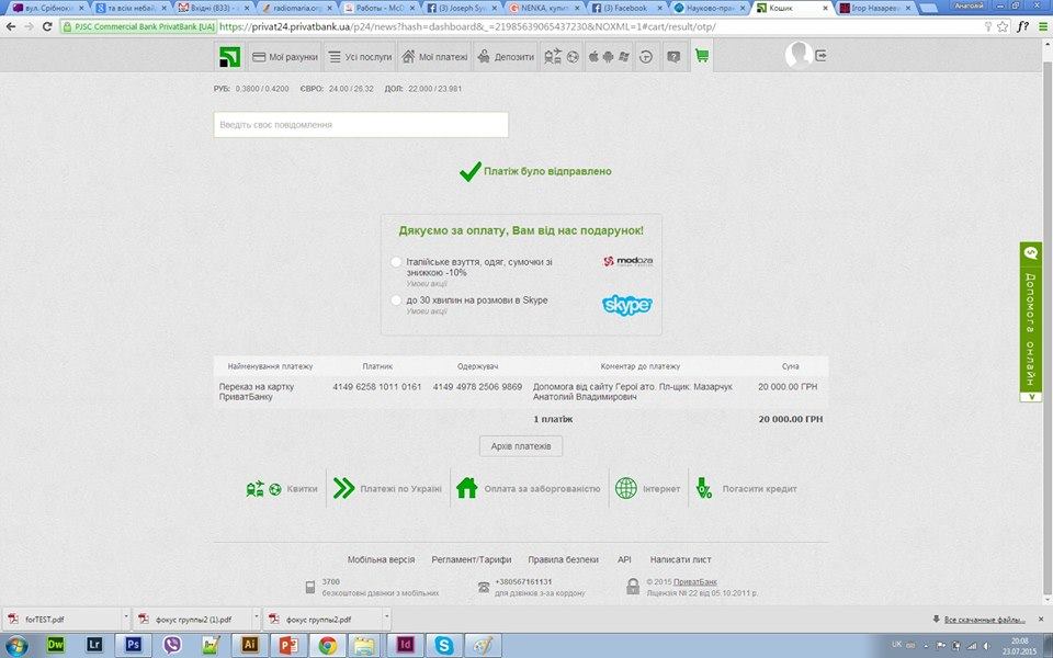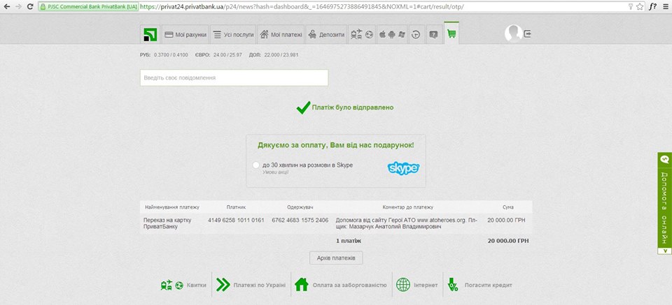 Зокрема, по 20 тисяч гривень надійшли на рахунки Ігора Назаревич та Марини Ковальчук (дружини Юрія Ковальчука).