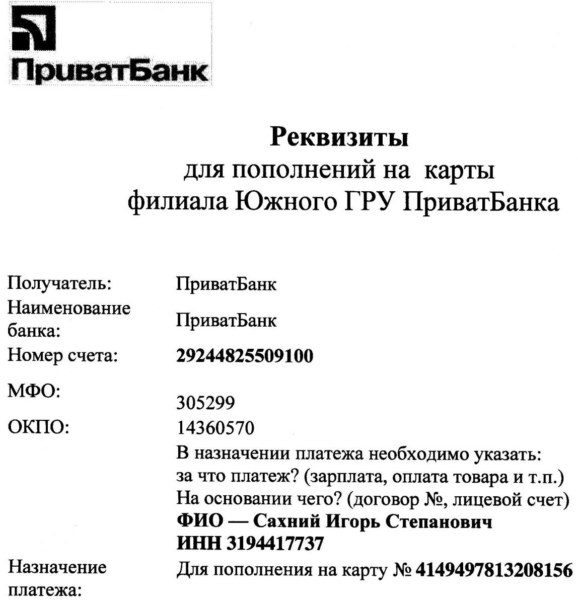 Реквизиты: 4149 4978 1320 8156 ПриватБанк