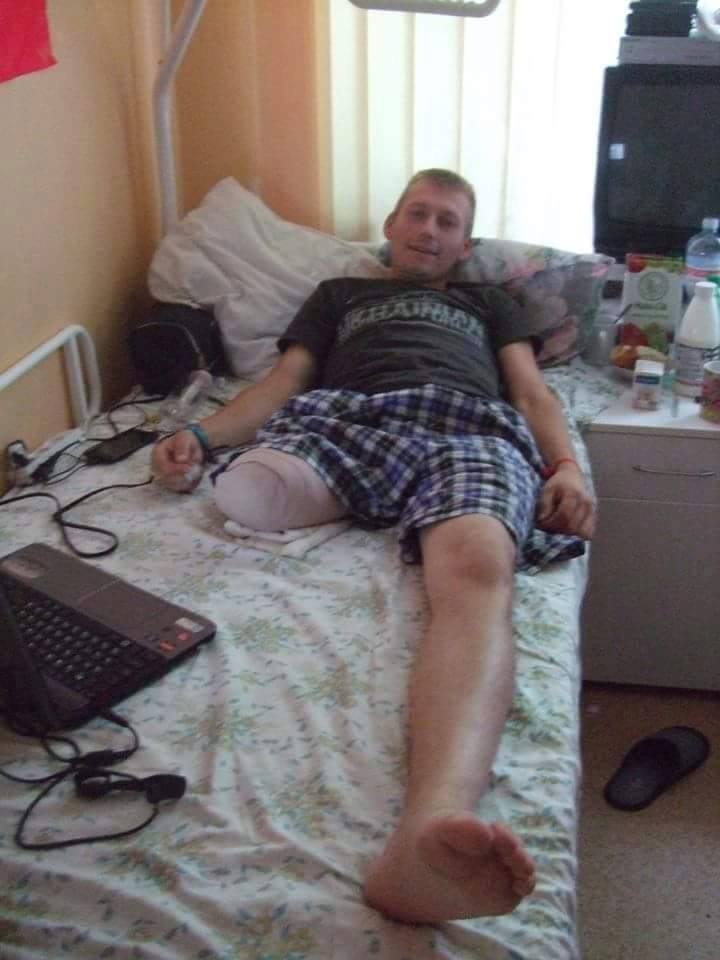 First, Oleksandr was taken to the field hospital and then – to Kharkiv military hospital.There he stayed a week and a half in intensive care ward.Then doctors moved Oleksandr to Kyiv hospital where they tried to save his wounded leg but had to amputate it.