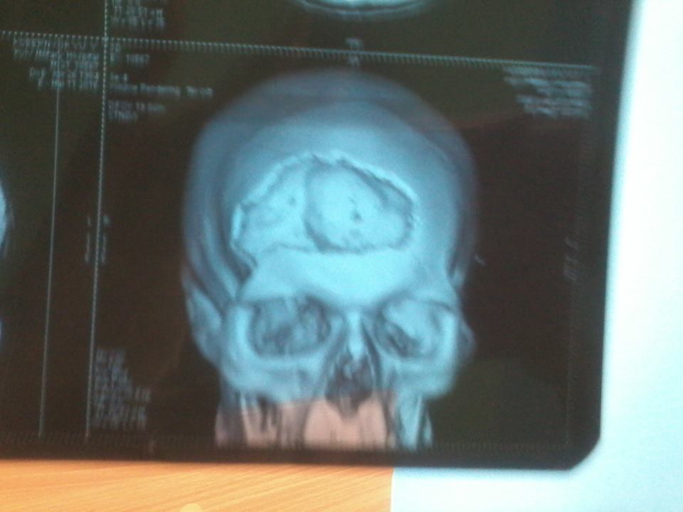 Діагноз: " Вогнепальне осколкове сліпе проникаюче черепно-мозкове поранення з вхідним отвором в правій лобній ділянці.Багатоуламковий вдавлений перелом лобної кістки. Пневмоцефалія, видалення мозкового детриту та кісткових відламків..." тощо.. .