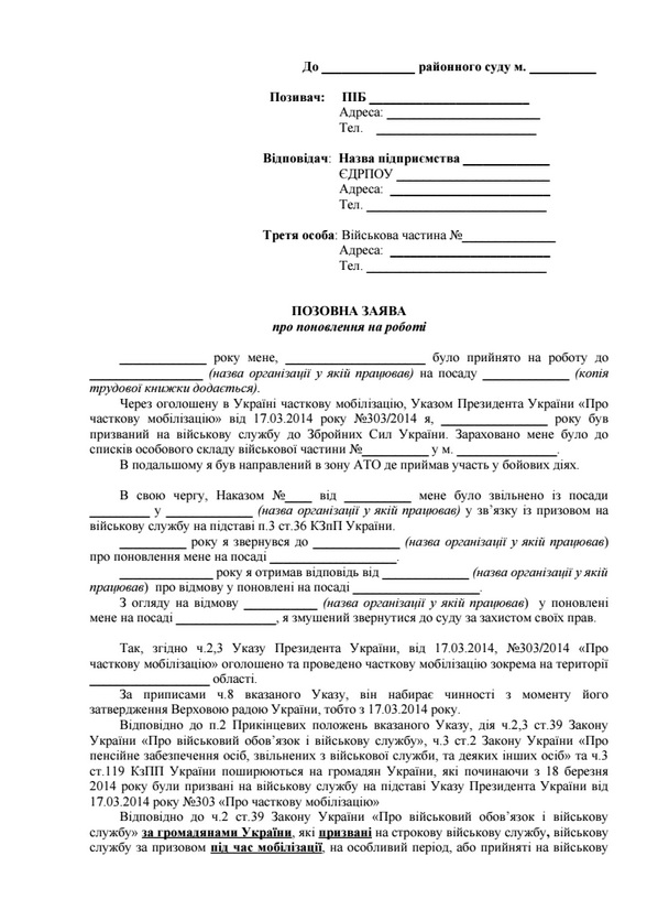 Скачати позовну заяву про поновлення на роботі учасників АТО